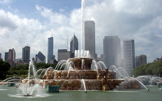 1927年建成的白金汉喷泉位于芝加哥市格兰特公园(Grant Park) 的正中央,是美国最美丽的喷泉,至今仍是世界第一大的照明喷泉。它的基座用粉红色的大理石筑成,水池直径85米,储水量达570万升,在喷水时每分钟喷水量达14000加仑。喷泉中央喷出的水柱最高可达46米。白金汉喷泉在4月中旬至10月中旬每天从早8:00至晚11:00的正点时刻进行喷泉表演。喷泉进行喷水表演持续时间为20分钟,间隔时间为40分钟。黄昏时分,喷泉会与灯光和音乐一起配合,中心水柱及四周几百道水花会随着电脑的控制和着音乐,变换着高度喷射而出,变幻着的各色灯光也会从喷泉底下照射上来。令白金汉喷泉璀璨夺目,蔚为壮观。