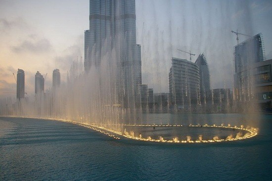 迪拜哈里发喷泉是世界最大的喷泉,由原世界第一美国Bellagio喷泉的制造商WET公司设计的,总投资2.18亿美元,比美国的Bellagio喷泉大25%,成为目前世界最大的音乐喷泉。它的总长度为275米,最高可以喷到150米,相当与一栋50层楼的高度。该喷泉会喷射2.2万加仑的水,并配有6600个灯光以及50个彩色投影机。喷出的水柱有1000多种变化,可以说是名副其实的千变万化。伴随着数首阿拉伯以及来自世界各地的歌曲,喷洒的水柱像是在人们面前跳着优雅的舞蹈,每一场使用的音乐不同、编排的舞姿也不同,一会像一群苗条少女婀娜多姿、翩翩起舞;一会像一列武士整齐划一、高亢有力;一会喷出所有水柱气势磅礴、雄伟壮丽。尤其是播放阿拉伯乐曲时,一排排打着细细的水柱,随着阿拉伯那种欢快、慢节奏的乐曲。既有音乐、又有舞蹈、还像烟火。据报道Dubai Fountain的灯光可以在20英里的内任何一个地方看到,让它成为中东地区最亮的焦点。