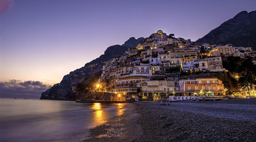 意大利阿玛尔菲海岸。紫蓝紫蓝的天空,暖黄暖黄的灯火,浪漫与温馨同行。
