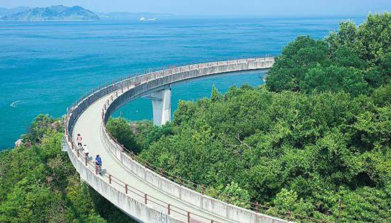 戏旺沿海大道位于日本西部广岛县,连接着好几个风光旖旎的小岛,最初是为供人们散步而建。这条大道全长仅40英里,一天之内便可骑完。