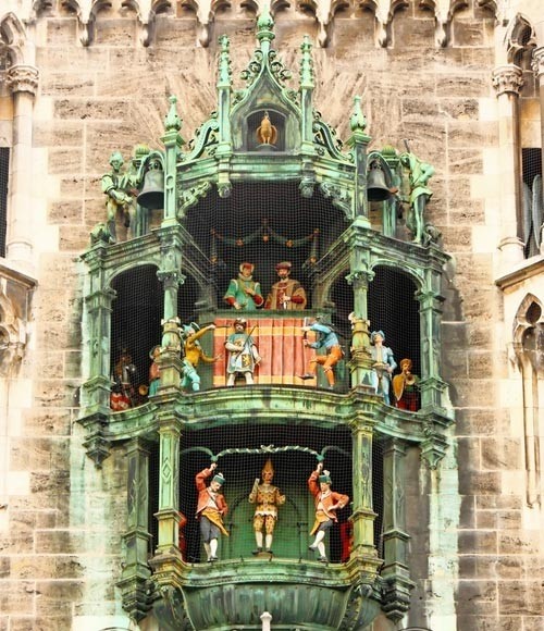 这座钟琴内置43个钟铃和30个真人大小的机械玩偶,玩偶象征着德国历史上三件牵动人心的大事,一是威廉五世公爵与洛林公主勒娜特成婚时候的欢庆场景,二是一场紧张的竞赛,三是人们在街头舞蹈,驱赶黑死病的场景。这三处场景分布在钟琴的不同层面,表演过程持续15分钟以上。市政厅钟琴建于20世纪初期,主要目的在于为群众提供娱乐活动,报时功能倒居于次要地位。钟琴内的玩偶在每天11点开始表演,夏季每天中午和下午5点会增加一场表演。