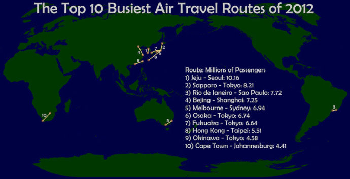 译注:韩国的济州岛-首尔航线排名第一,2012年的旅客数是1016万。日本国内的航线占了4条,而且都与东京