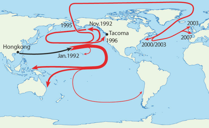 19.两万九千只橡皮鸭从太平洋中部一艘货船上掉落后的不同登陆点