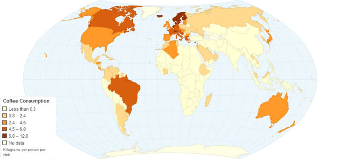 译注:北欧仍然居首。咖啡的原产地非洲和中国的人均消耗量处于同一水平。