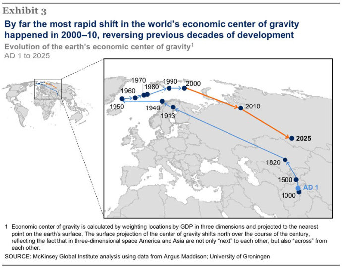 29.自公元元年以来世界经济中心的重心的变化情况(McKinsey&Company供图)