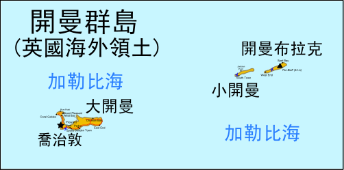 开曼群岛(Cayman Islands)位于加勒比海西北部,牙买加岛西北约290公里(180哩)。由大开曼、小开曼和开曼布拉克3个岛屿组成,面积259平方千米。人口56,732(2010年),黑人占25%,白人占20%,44%为混血种人,2012年人均收入平均为47000美元。英语为官方语言和通用语。居民多信奉基督教。首府乔治顿(GeorgeTown),位于大开曼岛上,人口27,704(2010年)。地势低平,珊瑚礁环绕。热带气候。年均温约24℃—30℃。年平均降雨量约1,200毫米。经济以旅游业和金融业为主,有海洋捕捞业(捕海龟、沙鱼),农业不发达,种植甜薯、马铃薯、椰子、面包果、香蕉、芒果和柑橘等,还有棕榈、洋苏木和桃花心木。主要进口机械、运输设备、燃料、粮食和食品,出口鱼类、花卉(特别是兰花)、龟肉、龟壳和龟皮。是世界上第二大避税天堂。3个岛上均有机场。开曼群岛目前在世界上是仅次于美国纽约、英国伦敦、日本东京