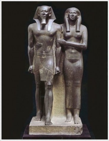 闪绿色粘板岩雕刻,高约142厘米,约创作于公元前2600年,现收藏于美国波士顿博物馆。这是埃及古王国第四王朝时期的一尊双人立像,也是当时帝王立像中最典型的代表。雕像刻划的是埃及古王国第四王朝第五个法老门考拉和他的王妃。