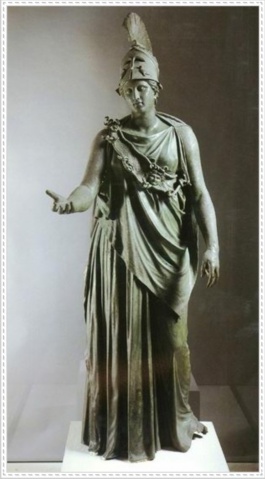 雅典娜为雅典城的守护神,也是代表智慧的女神。原作为巴底农神庙大殿的主像,全身高达13米,用银白色大理石雕成,局部镶嵌着象牙与黄金,可惜已在拜占庭帝国时代被毁坏。这里介绍的是大理石小型摹制品。在这件女神雕像中,她头戴战盔,身着希腊式连衣长裙,护胸和甲胄上装饰有蛇形饰边和人头像;她裸露双臂,透过薄衣裙可隐见丰艳健美而有力量的身体;衣裙褶纹和饰物造成横竖线条的疏密变化美;她的手势动作可能是执长矛和托物,整个形象富有女性的温柔和充满生命,更多的是人性,绝少神性,这表明希腊化时期艺术已走向世俗化。