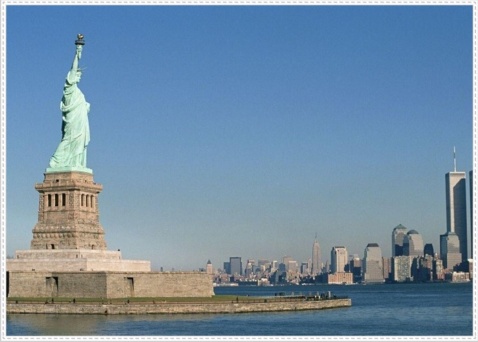 美国的象征是世界著名雕像之一。这尊铜像的选型,是按照希腊神话中女神的美丽形象建造的。女神头上戴着额箍,右手高举火炬,左手拿着《独立宣言》面容端庄而慈祥。女神像高46.5米,连同它的基座有93米高。女神像是用2.4厘米厚的铜板一部分一部分铸成的。基座底部是一个博物馆,参观的人可以进到铜像里面直到女神头部顶端,那儿可以容纳30多人,能通过玻璃窗俯视纽约的全景。