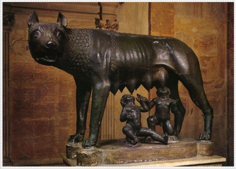 青铜,高85厘米,约创作于公元前500年,现收藏于意大利罗马市政博物馆。雕像取材于罗马建城的传说:著名的特洛伊战争结束后,特洛伊王子逃到意大利半岛,建立了阿尔巴城,世代相传;后来,一个名叫努米托耳的国王被其弟阿木留斯推翻,儿子被杀,但他的女儿为战神所爱,生下一对双胞胎罗穆路和瑞穆斯,却被阿木留斯放入篮子中丢人台伯河;这对兄弟后来被一只母狼发现并收留抚养,不久,被牧人发现收养;他们长大以后,杀死仇人,救出外祖父,创建了新的城市;后来罗穆路杀死了瑞穆斯,并以自己的名字命名这座城市为罗马。这尊雕像所刻划的就是曾经哺育了罗马创始人的母狼的形象。这尊雕像是埃特鲁斯坎人的艺术杰作,对罗马人来说,它还具有纪念碑意义,人们把它作为民族发源的始祖而给以顶礼膜拜。现在,雕像《母狼》已成为了罗马市的象征。