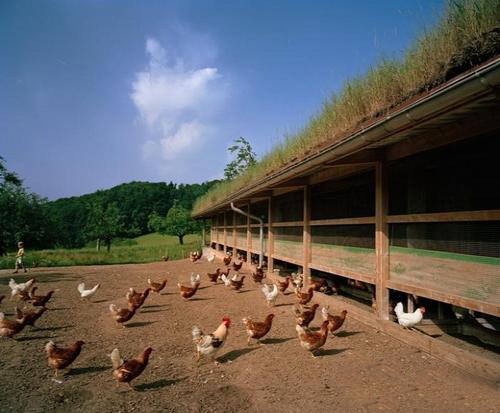 瑞士农民马塞厄斯· 埃格琳打算为鸡场搭建一个新窝棚,他在棚顶种植了一块草地代替了遮荫棚。和临国德国一样,瑞士已建立健全法规保护绿地,建造绿色草皮屋顶成为符合环保标准的一项常规策略。
