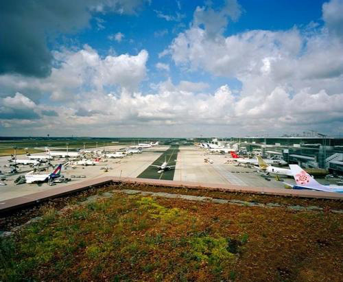 法兰克福国际机场是德国最繁忙的机场,自1990年至今,屋顶已经堆聚了将近50万平方英尺的枝叶。机场20多个绿色屋顶不仅有助于减弱飞机噪声,植物荫蔽下的屋顶建筑的使用寿命也增加了一倍。