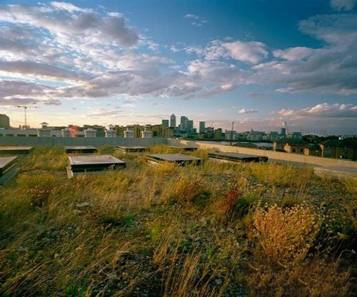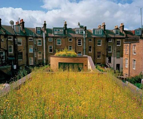 这些传统旧式伦敦排房的窗户曾经一打开,看到的是破旧的香肠工厂。如今,居民看到的是野花盛开的草坪。这是建筑师贾斯丁·比尔新家的绿屋顶。绿屋顶的隔离作用有助于提高家用太阳能的利用效率。