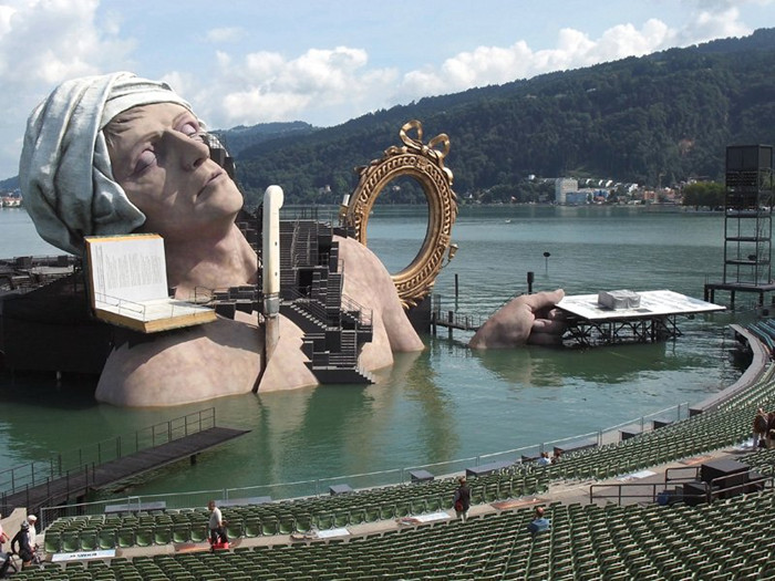 “Seebühne”在德语里意指“海上舞台”,而这个名称确实也很贴切,因为该舞台真的是浮在水面上的。布雷根茨音乐节于1946年开始在博登湖(Lake Constance)上演出,舞台则于1950年最终建成。浮动舞台现在上演着各式剧目,从《魔笛》到《西区故事》,但抛开剧目本身不说的话,他们的舞台搭景也是足够疯狂的(此图出自2011年舞台剧《安德烈·舍尼埃》)。