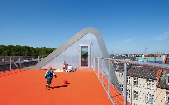 丹麦一家公司的建筑师在哥本哈根人口稠密地区设计了一个令人难以置信的超酷天台游乐场。游乐场位于房子顶部,屋顶地面采用鲜艳热烈的橘红色,是一个理想而节约空间的室外场所。许多大胆的孩子们在这里玩耍、荡秋千或者做其它的活动。安静的时候,家长们带着自己的孩子在观景平台上欣赏城市景观,让身心得到放松。虽然屋顶上的围栏比较低,家长们担心孩子在高处不安全,但在这里玩耍的孩子们长大后不是会比一般人更勇敢、更自信吗?