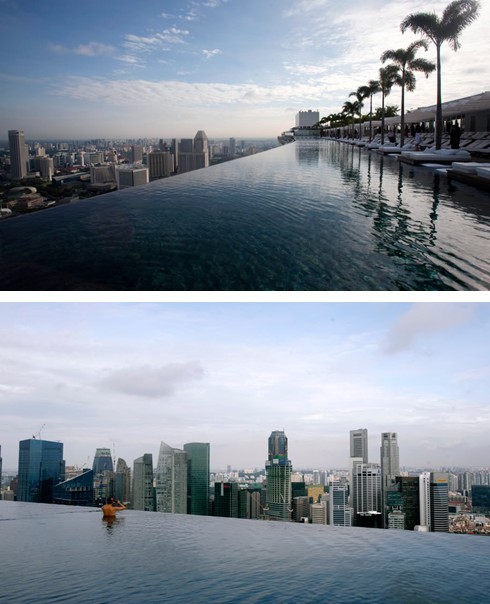 新加坡打造了全球最高最奢华的屋顶游泳池。该游泳池设在55层的滨海湾金沙酒店的楼顶。这个露天泳池距离地面200米,池长150米,是奥运会泳池长度的三倍,被称为全球最大的室外无边际游泳池。据说,建在楼顶的泳池看起来如同水面延伸到地平线一般壮观。你可以一边尽情游弋,一边俯瞰新加坡靓丽的城市风光。