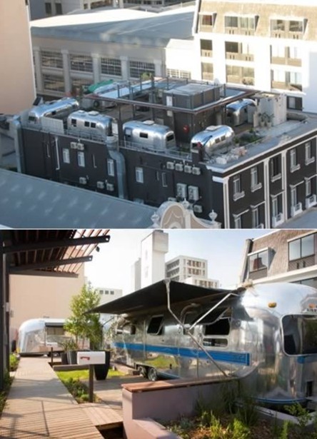在南非开普敦的时尚爸爸大酒店(Grand Daddy Hotel )楼顶有一处奇观--气流拖车客房,是由七个独立引进的老式气流拖车组成的七间套房,这在世界上尚属首例。