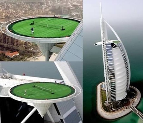 迪拜的阿拉伯塔酒店又称帆船酒店,它是世界上第一家七星级酒店,建立在海滨的一个人工岛上,是一个帆船形的塔状建筑,一共有56层,顶端设有一个世界上独一无二的空中网球场。据说,该网球场原是直升机停机坪,距离地面200多米,让人心惊肉跳,堪称世界上最危险的网球场。