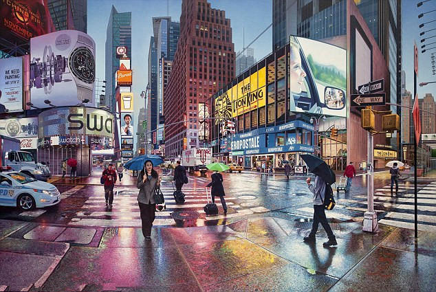 南森-沃尔什过去12年总是在画各个城市的景色,专注每一个细节,每一块砖,街上的商铺等等,他擅长利用光影效果和几何构图来达到逼真效果。沃尔什的足迹遍布纽约、巴黎和巴塞罗那等地,图为他画的纽约时代广场。
