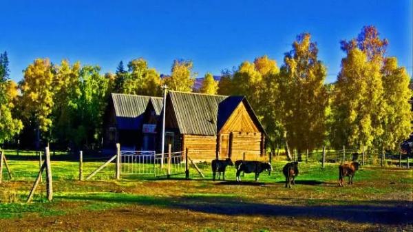 白哈巴村被称为西北第一村和西北第一哨,位于新疆阿勒泰地区哈巴河县铁热克提乡境内,该村的所有建筑均由原木筑成,以外观很古朴的小木楞屋为标志,具有欧式村寨的特色,墙体和顶棚用整根原木垒砌、拼接而成,顶部再用木板支撑成“人”字形的尖顶,可防雨防雪,以保证住房的安全。