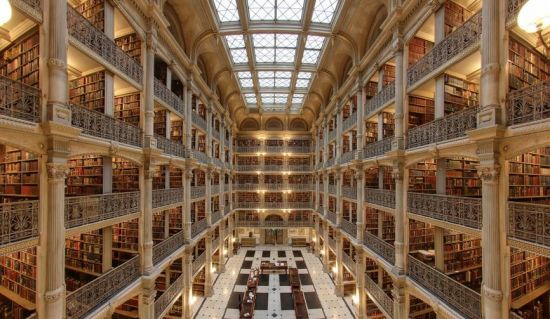 位于巴尔的摩市的皮博迪图书馆是约翰·霍普金斯大学的一部分。普赖斯说,“一眼望去有无数的书和精雕细琢的栏杆。一座工业时代的寺庙却创造出教堂般的效果。尽管满是古典主义的细节,但它的立柱、柱顶、露台、扶手和天花板都是铁铸的,而所有的重量由最下面的音乐厅来承受”。