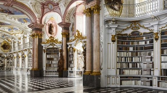 阿德蒙特图书馆堪称世上最美最大的修道院图书馆,于1776年建成。坎贝尔说,“顺着朴素的长廊和楼梯步入那明亮而震撼人心的的大厅时,仿佛有一种登上舞台的效果。这没有书桌,因为它从来不是学习的地方,只为观赏而建。修道士会把取走的书带到自己的屋里阅读”。