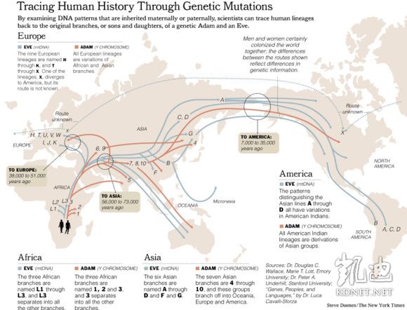 但是,由于线粒体的特殊性质,它的突变过快而且长度太短。这使得它提供的信息量很有限,而且在群体间的分布格局较乱,这一切则由NRY来捕捉。NRY 上不断有新的SNP,到2001年,斯坦福大学的PeterA.Underhill等在全世界人群中发现了218个SNP位点,构成了131种单倍型。这些单倍型构成的谱系与线立体谱系的共同之处,也是证明现代人十万年前发源于非洲。