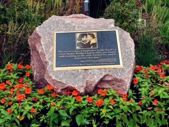 这块牌匾放在沿公路商业区外,据说是用来纪念1989年美国总统奥巴马和他的第一夫人米歇尔的初吻场所。