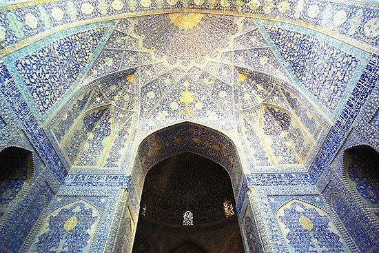伊朗伊玛目清真寺坐落在世界最大的广场--伊玛目广场旁边,清真寺里外均由精美的淡蓝色和黄色瓷砖镶嵌而成。它是一座17世纪建筑,瓷砖的颜色随自然光而改变。主穹顶高54米,点缀着错综复杂的花卉马赛克图案,大门高达30米,堪称是萨法维时期(1502至1772年)建筑风格的最高典范。清真寺偏离广场45°倾斜修建而成,因此得以面向伊斯兰教圣地--麦加。