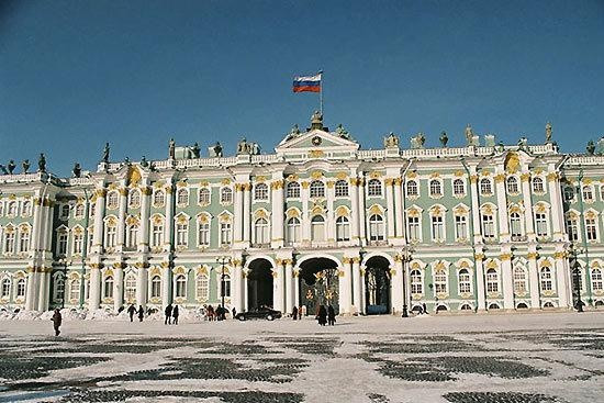 冬宫被认为是俄罗斯非凡的艾尔米塔什博物馆( State Hermitage Museum)的外壳,坐落在圣彼得堡内瓦河畔,由设计师拉斯特雷利(Francesco Bartolomeo Rastrelli)为俄国沙皇设计修建的冬日住所。冬宫占据整个街区,它具有巴洛克时期的所有奇思怪想的设计风格。屋顶边缘的雕塑像是要一头扎进内瓦河的潜水员。不难想象冬宫这个城市的标志建筑的修建向世界展示俄罗斯也有媲美欧洲的美丽建筑。