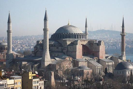索菲亚大教堂是伊斯坦布尔中心的地标建筑,周围的四个尖塔好似飞往月球的火箭。它作为一个东正教堂,始建于公元6世纪,后来作为清镇寺,从1935年又用作博物馆。这个巨型建筑在仅仅5年内就得以建成,恢弘的穹顶宽约31米,高56米。穹顶下方基身满是窗户包围,所有从里面往外看,感觉穹顶轻浮于在建筑上。