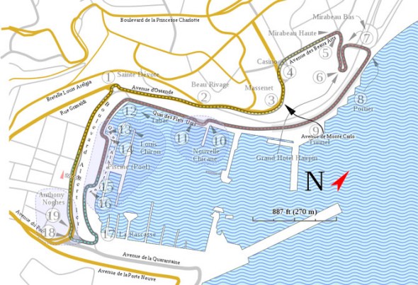 设置摩纳哥赛道需要6周时间,清理工作又需要3周时间。它拥有F1世界最慢的一个弯道,即“大酒店”(Grand Hotel)的发夹弯,赛车过弯时车速需降至每小时40英里(约合每小时64公里)。此外,它也拥有F1世界速度最快的一段赛道,车手穿过一条隧道时的时速可达到160英里(约合每小时257公里)。这是一条很难征服的赛道,需要车手拥有非凡的技能。能够在摩纳哥赛道赢得冠军是所有车手职业生涯的一个莫大荣誉。第二幅图片用黄色和紫色标出了F1赛车比赛中的实际路线。