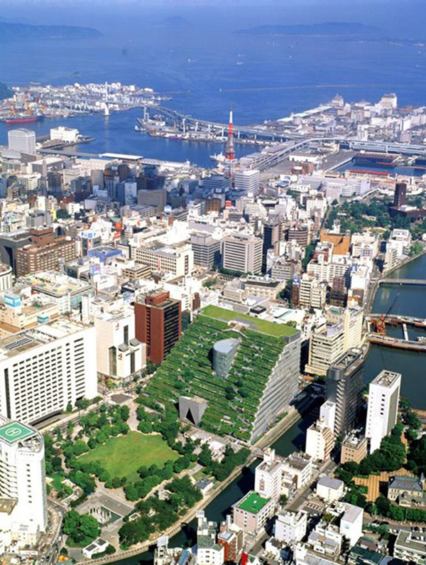 位于日本福冈,由阿根廷建筑师Emilio Ambasz设计,各种自然森林奇观包括瀑布都能在这里找到。通往屋顶的途中还会经过一间半圆形玻璃房,里面有展览室、商店等。