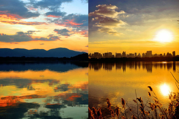 左:加州La Jolla Black’s Beach的日落; 右:北京颐和园的日落
