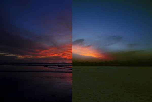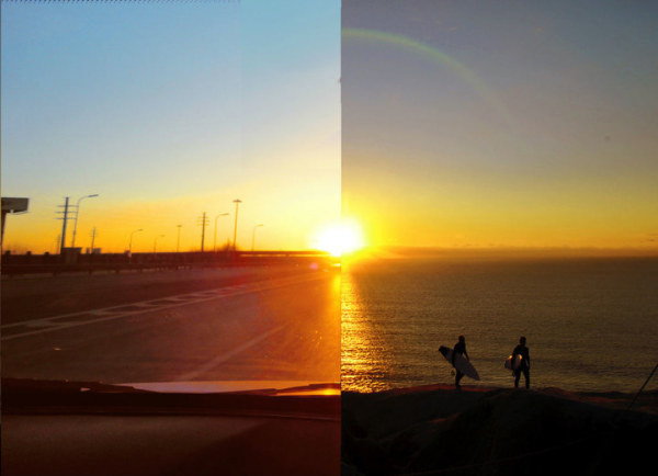 左:北京机场高速的日出; 右:加州La Jolla Black’s Beach的日落