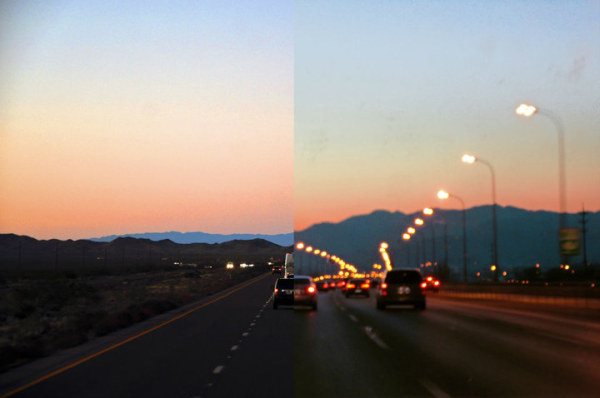 左:加州66号公路的日落; 右:北京西北四环的日落