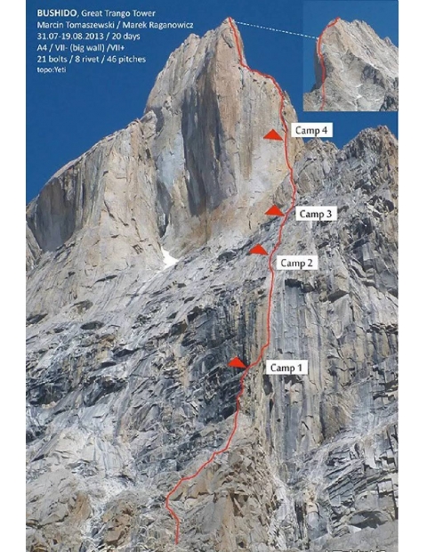 世界上有些山峰的名字会给攀登者带了恐惧和敬畏,川口塔峰群峰就是其中之一。高耸入云的岩柱上分布着世界上最难的大岩壁线路,吸引着世界上最顶尖的攀登者前来攀登。但这里不仅仅是纯粹的攀登难度,到达这些线路下面本身就是一场探险。攀登始于约6000米海拔的高度 – 这个高度足够一架飞机爬升飞行了。2013年波兰大岩壁高手Marek Raganowicz和Marcin Tomaszewski完成大川口塔峰一条46绳距的新线路Bushido,花了20天的时间。