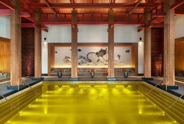 这里的金色能量池由上千块镀金的瓷砖铺成,长期出现在每一个土豪的春梦中。这里的水是有治疗功效的盐水,温度被保持在27到30度之间