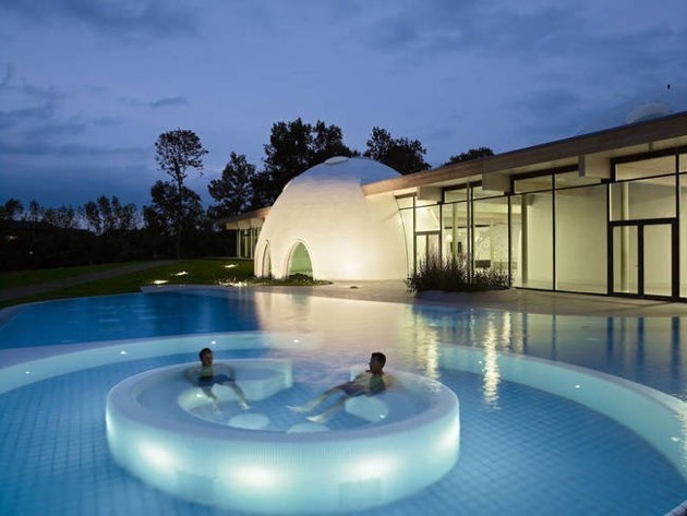 这个独特的浴池中有很多风格各异的圆顶屋,不仅包括比较私密的浴盆,还有供大家娱乐的活动区,每个区域的音乐和水温都不同。