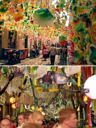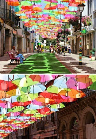葡萄牙的阿格达小镇有一条名为“漂浮雨伞”的街道,街道上方悬挂着大量五颜六色的雨伞,就像漂浮在空中一样。这一缤纷多彩的景观其实是“摇曳的阿格达(Agitagueda)”艺术节展览的一部分。事实上今年是这座小镇第二次使用鲜艳的雨伞来装饰街道了。这些雨伞不仅能遮阳,更是提供了一道亮丽的风景线。人们太喜欢这些雨伞了,不厌其烦地使用它们,几乎形成了一项传统。