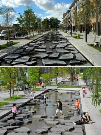 Roombeek是城市核心地区的一条商业街,以Roombeek小溪命名。这条小溪曾经流入地下,现在又重新引出地面。如今,溪水已成为城市环境的一部分,也是该区的中心点。小溪采用不对称设计,随着街道的变化时宽时窄,展现出独特的空间感。小溪底部采用粗糙的表面处理,以减缓水流速度,并形成水面反射造型。溪中棱角分明、错落有致的踏脚石喻示着大自然的随机性,也纪念2000年5月曾经摧毁该街区的烟火爆炸事件。