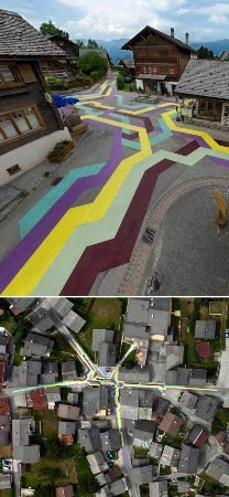 每年夏天,瑞士的滑雪小镇维尔科林会邀请一些艺术家来此创作。但是他们要创作的可不是雕像之类,他们是要将整个小镇变成一个巨大的艺术品。 2010年时,小镇请到的是著名艺术家Sabina Lang和Daniel Baumann。他们认为,这座小镇的房子和外观都很古老,表面大多是古朴的木质结构,如果在街道上使用一些明亮的颜色与之形成对比应该非常有趣。于是他们使用地图进行测量,然后以处于街道几何中心的广场作为起点,向四周扩散作画。最终他们完成了一幅贯穿小镇街道的画作,使得整个镇子一下子鲜活起来。