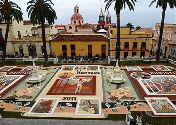加那利群岛的特纳里夫岛位于非洲西北部的大西洋上,这里的南部阳光海岸是著名的旅游圣地。但如果你不是只想沐浴阳光,就应该去北边看看,尤其是历史名镇奥罗塔瓦。每年六月的圣体节(Corpus Christi),那里将成为鲜花地毯的海洋。奥罗塔瓦老城内的街道保存得相当完好,随处可见狭窄的石子路边带着精致木雕露台的17或18世纪的房屋。走在这样的老街,处处是视觉的盛宴。尤其一到圣体节,所有的石子路上铺满了由玫瑰和天竺葵花瓣拼成的地毯,整座小镇真正地“绽放”起来。这些地毯还采用了大量来自泰德火山的火山沙作为材料,使地毯上描绘的人物拥有细腻的皮肤和栩栩如生的表情。2007年,这里的地毯作为世界上最大的沙画被纳入吉尼斯世界纪录,为世人所熟知。