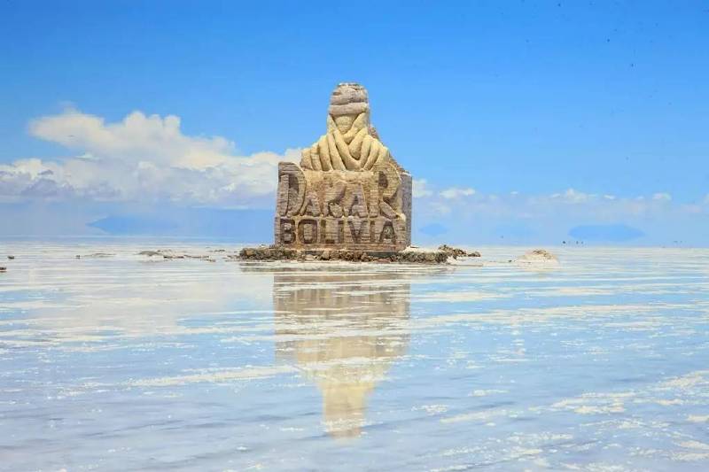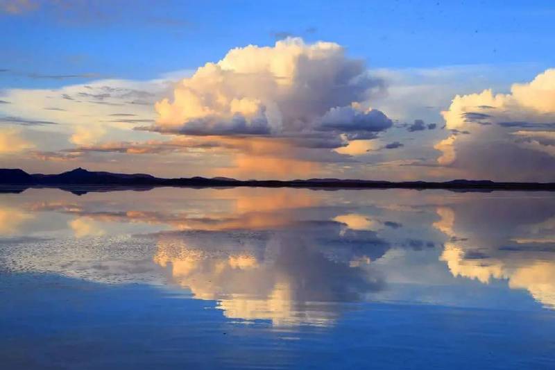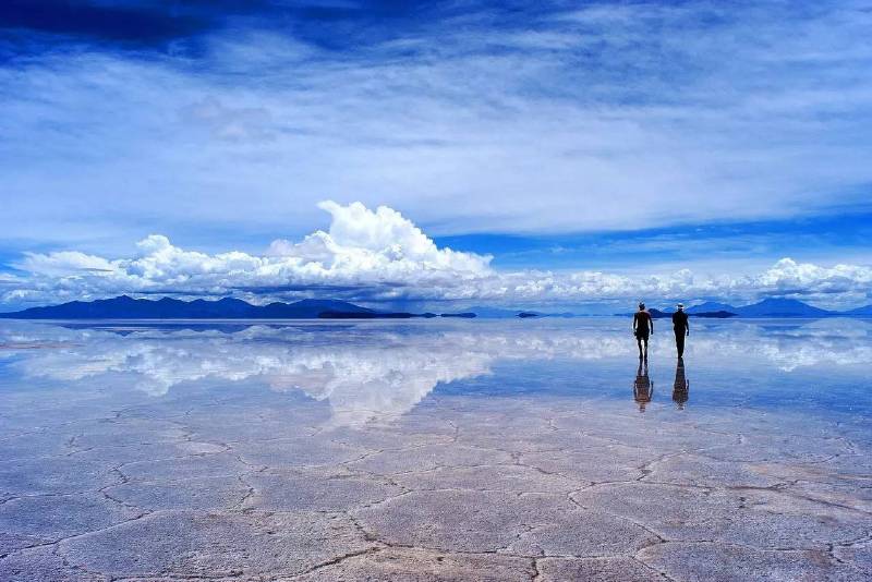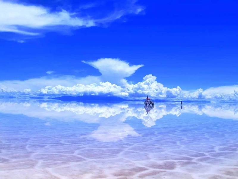 但是到了雨季,景象就完全不一样了。由于地处高原,地面平坦且宽阔,所以容易保持雨水的稳定而不易流动。湖底是坚硬的白壳,像龟背一样,图案大部分呈现五边形。越靠近中心地带湖水越清澈,整片地带像一个大镜面一样,这也成为了众多游者向往此地的主要原因。