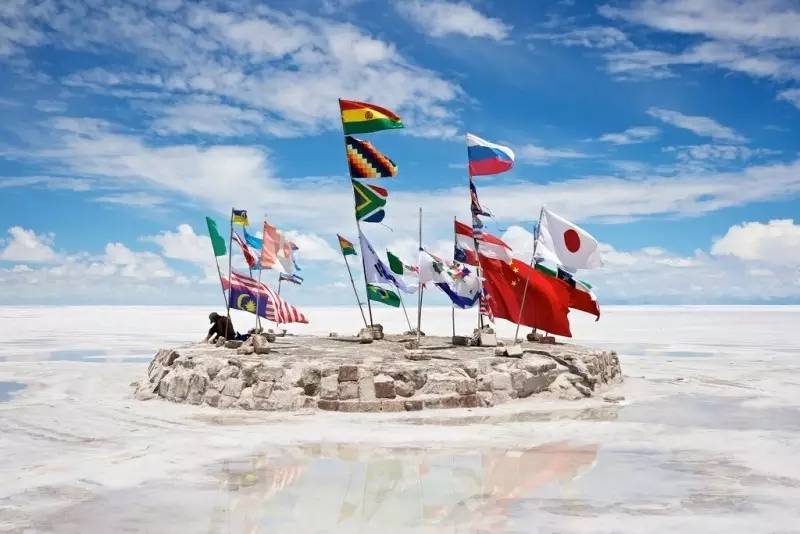 在这片盐地中还有一个不得不提到的就是插满旗子的区域,这里被视为英雄所到之地,每一个旅游达人来到此地都会把自己国家的旗帜插在这里,或者在此地合影留念自己的到来。是不是很有一种爱国情怀呢!