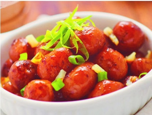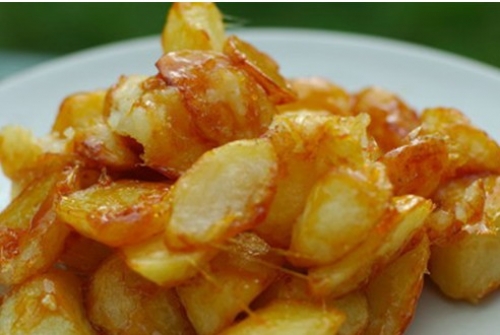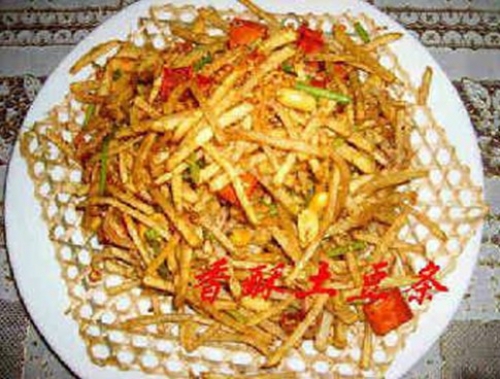 ②锅内放少许油,加热,放入白糖,不停搅拌,待糖熬成糖稀后,倒入炸好的土豆,不停翻炒,直到土豆全部都沾到糖稀,立即出锅。此品外脆内软,香甜可口,但需乘热吃,否则会变硬。