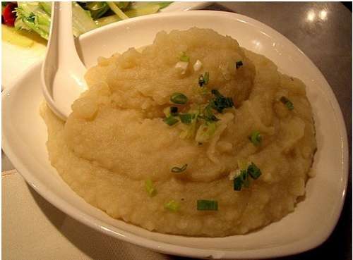 ①土豆两个蒸熟剥皮,用机器打成酱状。