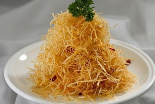 ③将烫好的土豆丝捞起,放在盆里,撒上蒜末、辣椒面(事先炸好的辣椒油也可以),不过没有现炸的香。