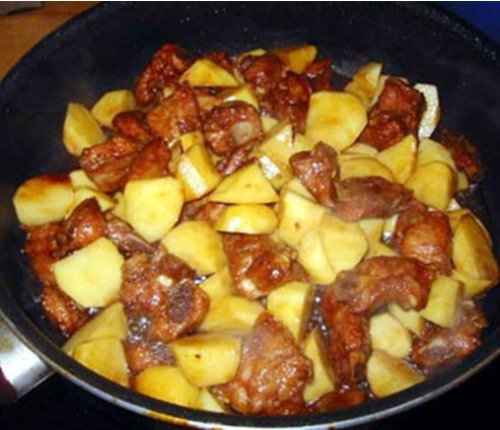 ②坐锅烧热油,放入剥皮后的土豆,翻炒,2-3分钟后放适量的清水、老抽上色。