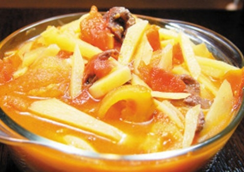 原料: 番茄50克、土豆150克、卷心菜50克、煮牛肉原汤750克、葱姜末、精盐、香油各适量。